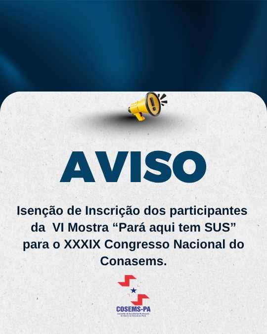 O Conselho de Secretarias Municipais de Saúde do Pará (Cosems/PA) informa que, por deliberação do Conselho Nacional de Secretarias Municipais de Saúde (Conasems), todos os autores que fizeram inscrição de experiências exitosas nas Mostras Estaduais, terão isenção na inscrição do XXXIX Congresso Nacional do Conasems, que será realizado em Porto Alegre, Rio Grande do Sul, no período de 12 a 15 de julho de 2026. As demais despesas como hospedagem e passagens, são de responsabilidade do próprio autor.